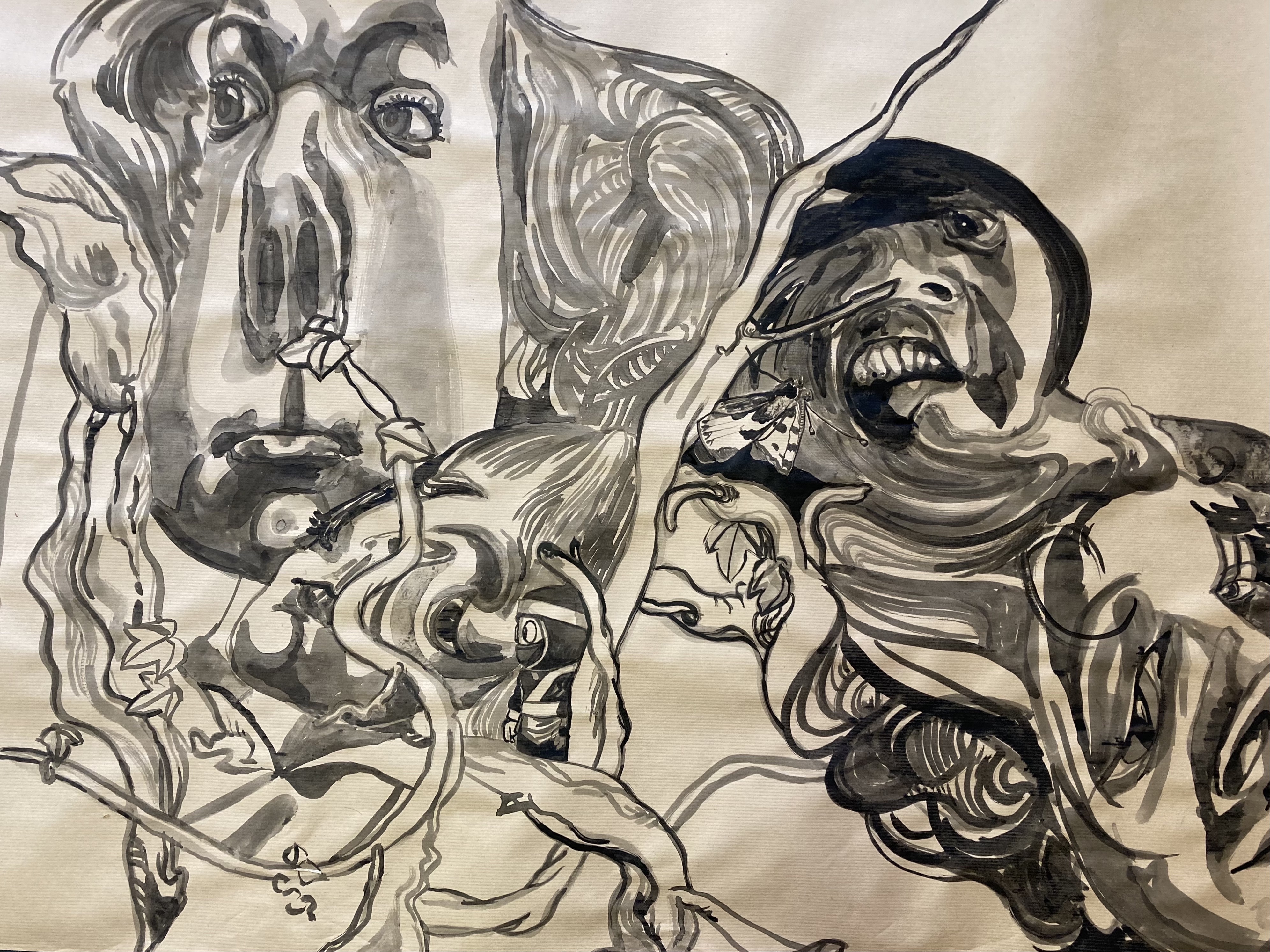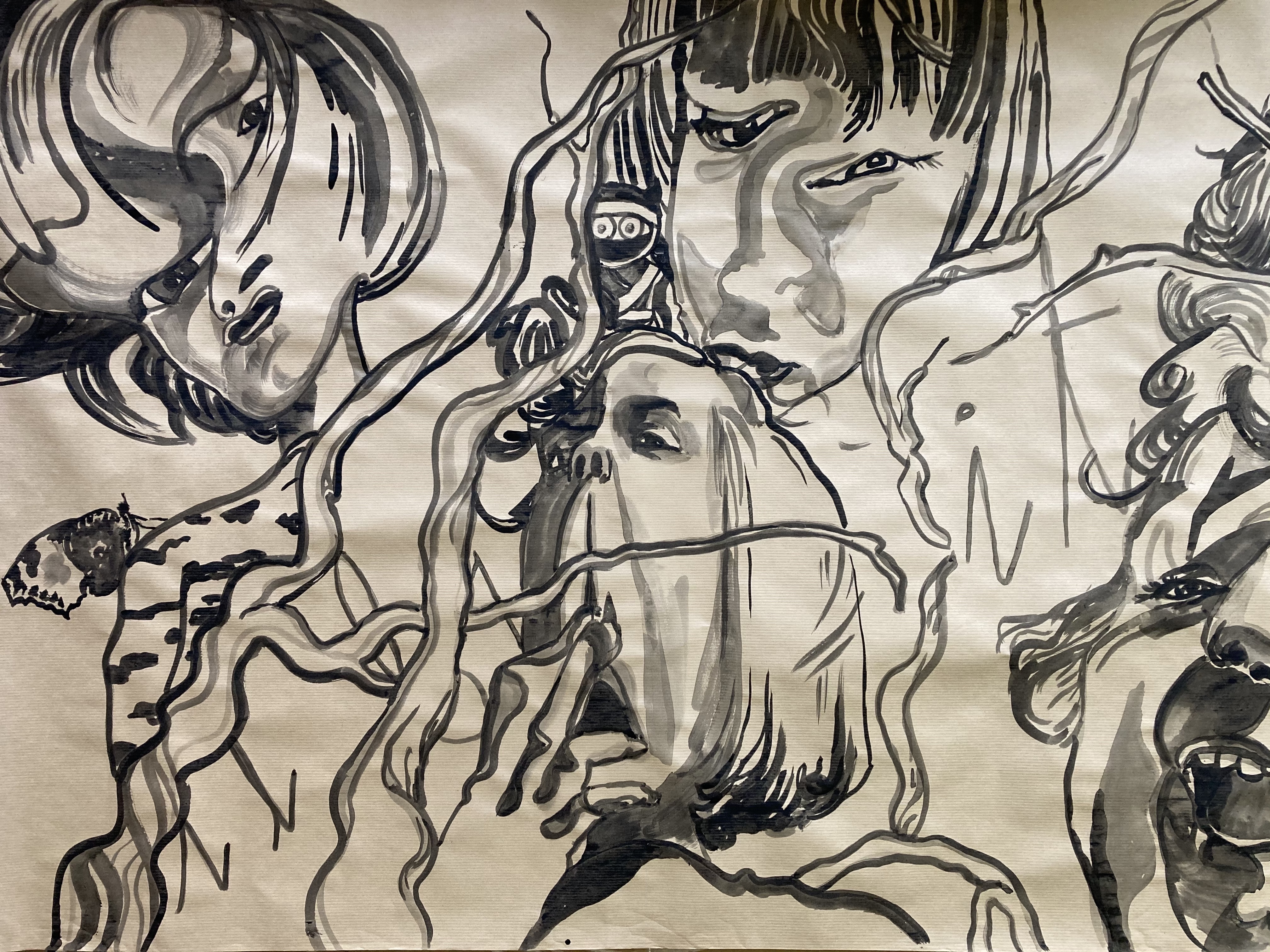 Cursive writing – my youngest kid turned 6 recently and hates doing his writing homework. He approaches his writing exercises like each letter is a completely new form that he has never encountered before and sees no reason why there should be any uniformity when rendering the letters. I am interested in the experimental flair he employs within his cursive writing endeavours. I took photos of some of the words from his writing homework, which spell it/bit/pit/hit/fit/sit and placed them across the drawing, so as to visually pull the viewer across the drawing. I drew the letters large so as to not allow them to be too recognisable when close to the image, however if you stand back from it you are more likely to see what they are. The distorted faces are arranged mostly in opposite diagonal pathways to the writing- this brings the eye upwards through the work.