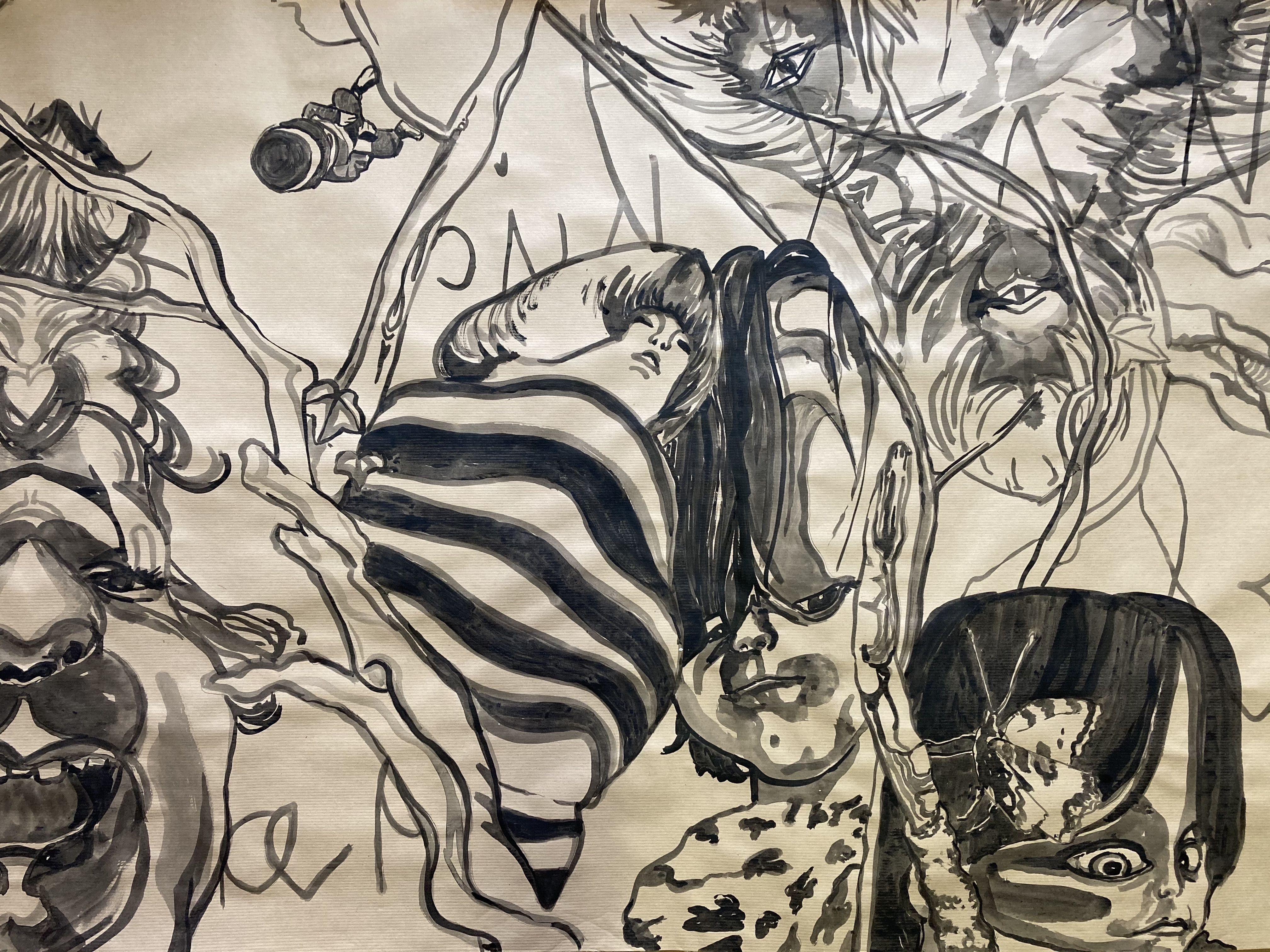 The main drawing is constructed from a series of drawings of photos my kids take of themselves on their ipad, which is connected to my phone. So whenever I open my photos on my phone I find a slew of distorted selfies of my kids. They LOVE doing this. As said before, these provide me with insight into how they, my kids, see the world. The idea of using these photos, which are visually interesting to me, as a basis upon which to make a drawing came about as they, these selfies, symbolise the present time. They represent lockdown, pandemic, being at home, being bored, not seeing people, placing extra importance in using devices as there’s less options of stuff to do. Visually I am interested in the distortion and the new perspectives, and I tried to make them fit together in some places, like jigsaw pieces.