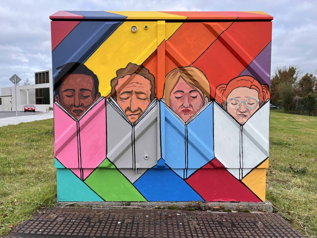 Most recently we completed the two large pump boxes located in the Island Carpark, Cloughleigh, Ennis. These are right next to the River Fergus so we painted on local wildlife, a heron and a duck , and used a colour palette with similarities to the locality. These two species of birds can be seen around the river on a regular basis.