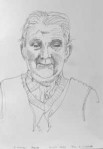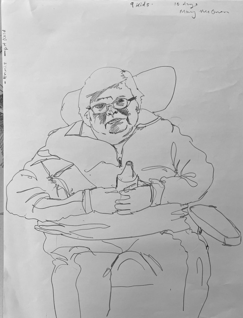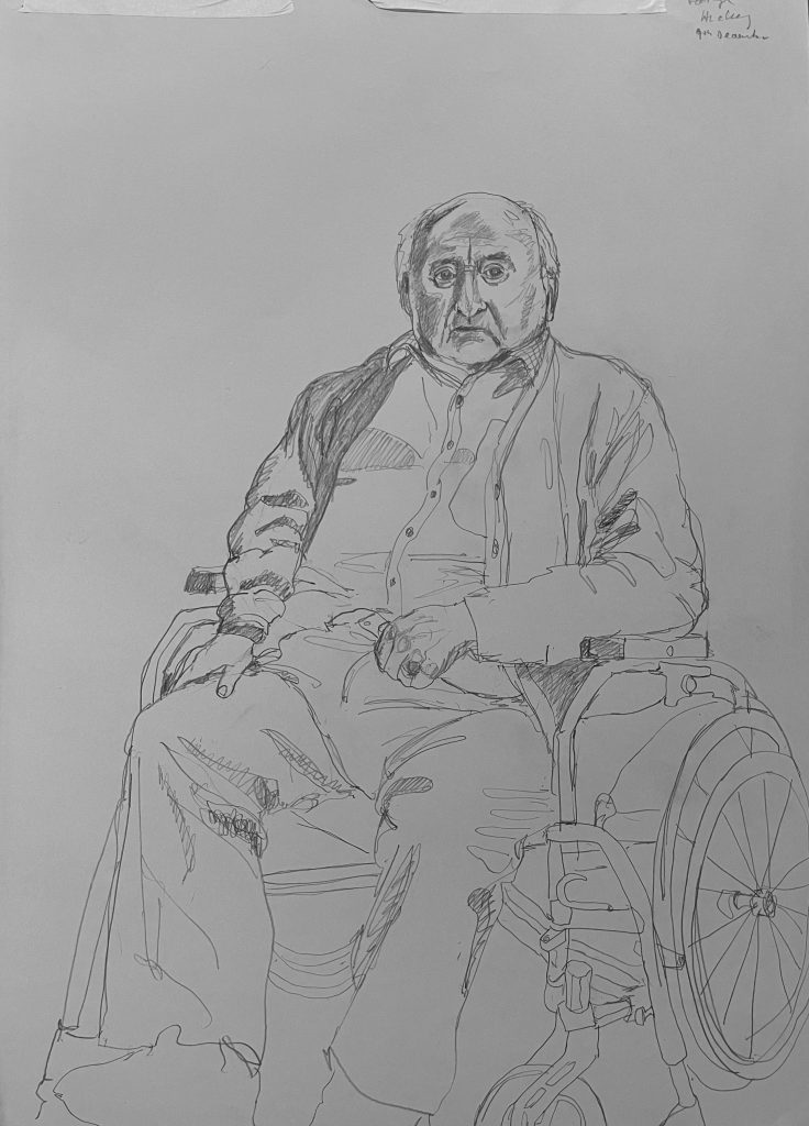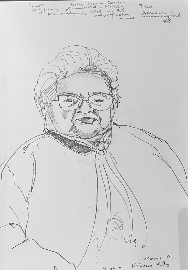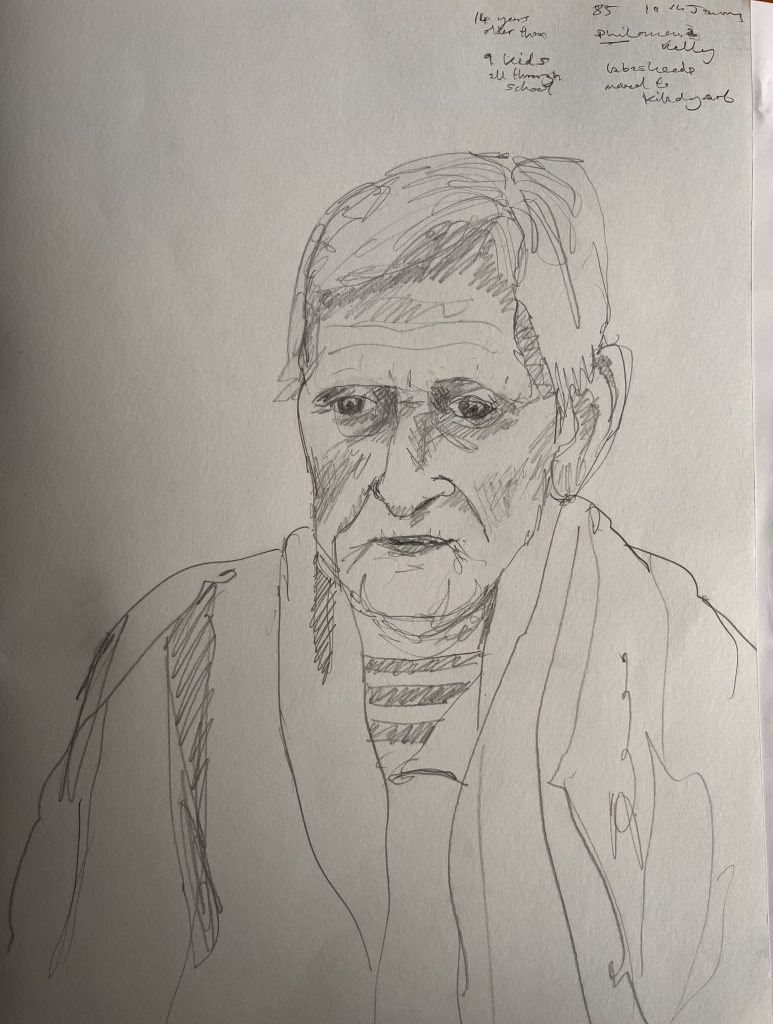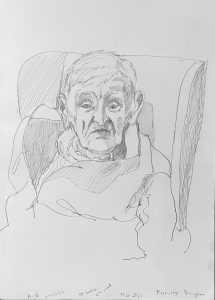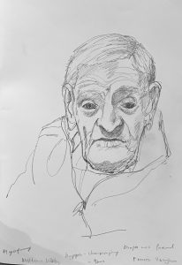 I am back in St Josephs Hospital drawing some of the patients. You are not supposed to refer to the occupants as residents as St Josephs is a hospital, not a nursing home. I started before Christmas, in December. Getting the correct vetting alone took months. Vetting is right and proper and necessary but I do with they would update the system as to how its administered here in Ireland. Getting the funding to do the work took even longer- it could have been a journey titled ‘Do not give up when you get lots of no’s’. However I was eventually fortunate enough to secure sufficient funding to start the project, through the good people at The Rural & Development Department of Clare County Council. Regarding access and vetting I had decided to just allow the elements over which I had no control to do their thing. It would happen when and if it was supposed to.