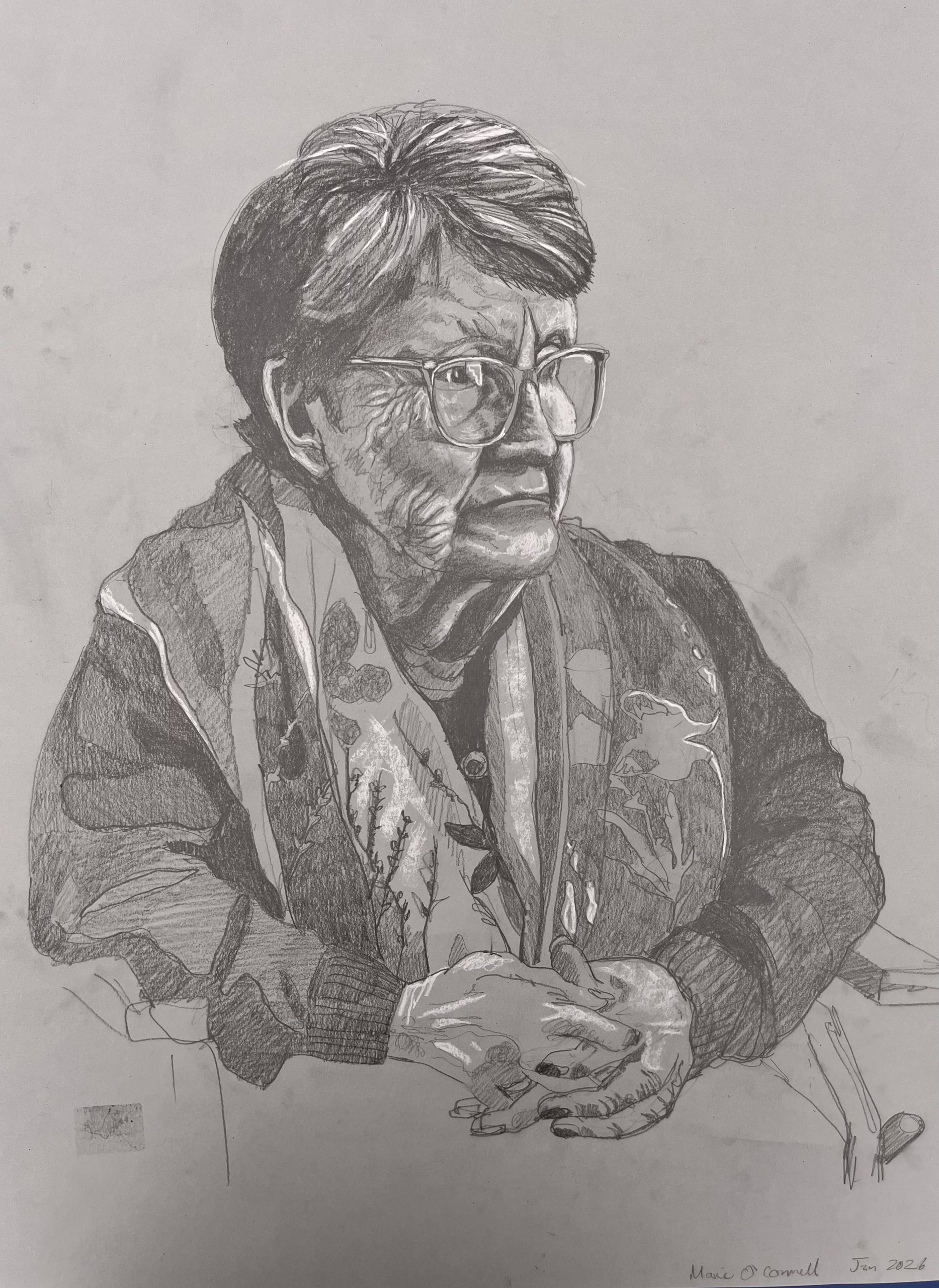 I am back in St Josephs Hospital drawing some of the patients. You are not supposed to refer to the occupants as residents as St Josephs is a hospital, not a nursing home. I started before Christmas, in December. Getting the correct vetting alone took months. Vetting is right and proper and necessary but I do with they would update the system as to how its administered here in Ireland. Getting the funding to do the work took even longer- it could have been a journey titled ‘Do not give up when you get lots of no’s’. However I was eventually fortunate enough to secure sufficient funding to start the project, through the good people at the Clare Age Friendly Programme based at The Rural & Development Department of Clare County Council. Regarding access and vetting I had decided to just allow the elements over which I had no control to do their thing. It would happen when and if it was supposed to.