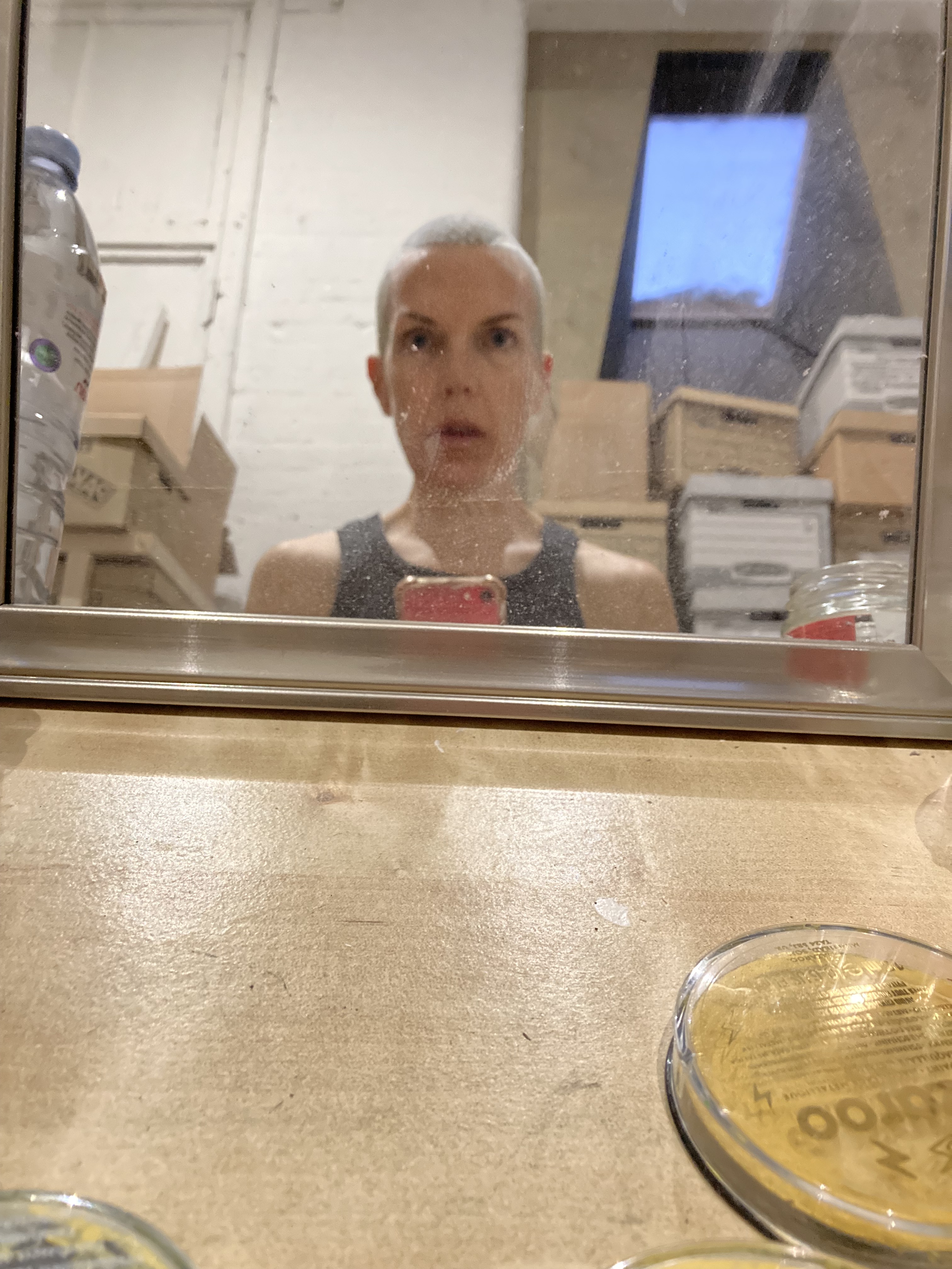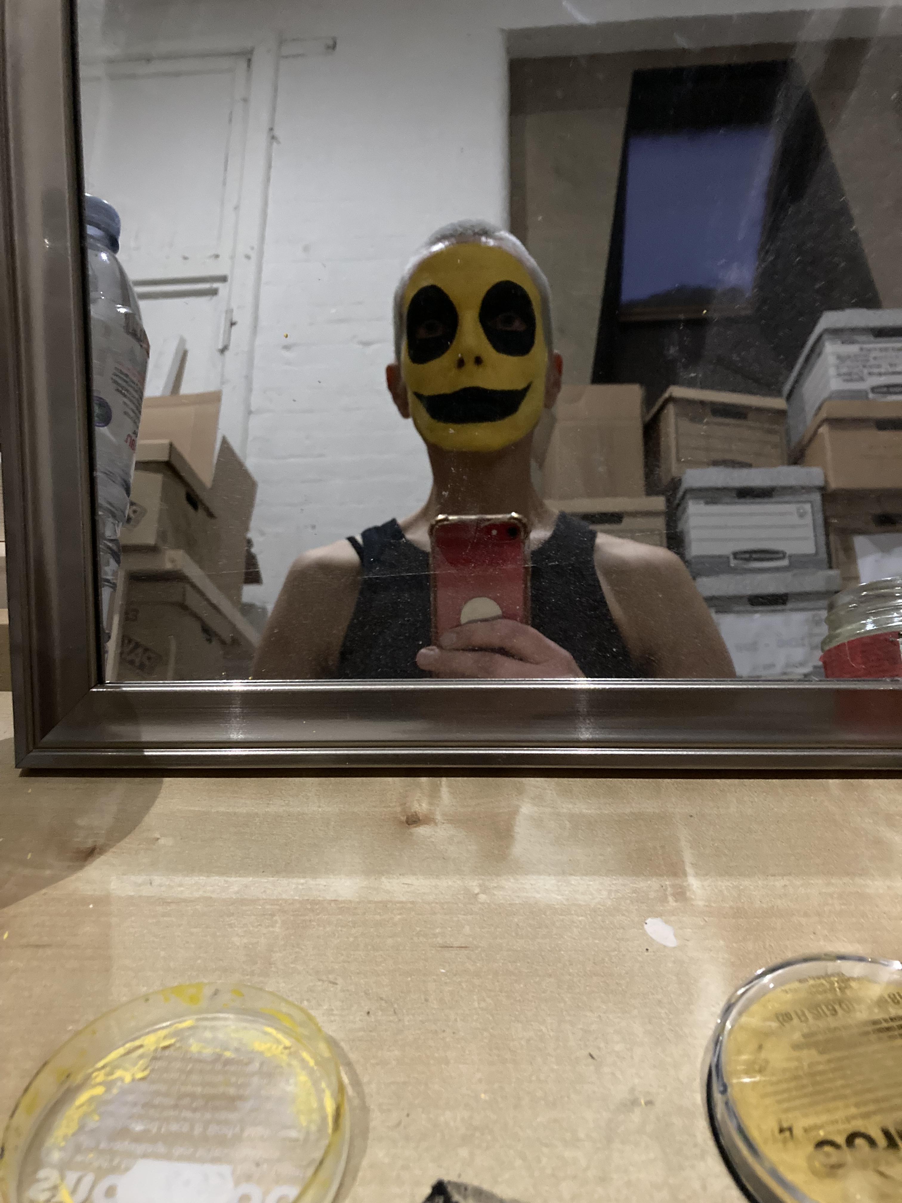 I sat in the resource room and painted up my face. I was particularly focused on trying to paint my smiley mouth in a neat black curve but was reminded from the last time that due to the undulations and faintly emerging but none thlese less emerging pouches on weither side of my mouth that this was proving challenging, as due to this my smile would not go on smoothly. I did my best and after 6.30, my start time, was forced to confront a less than perfect smiley smile and continue.