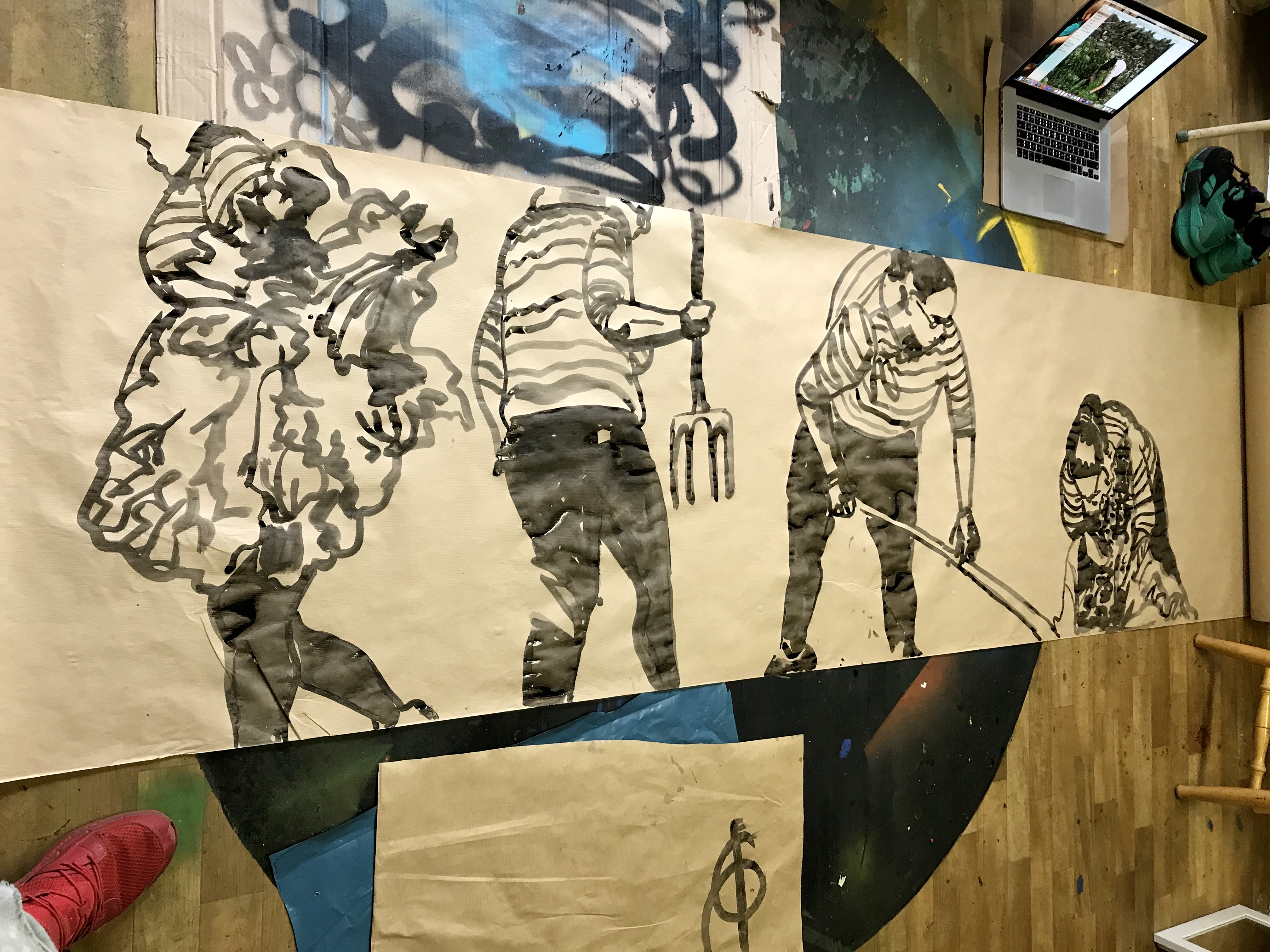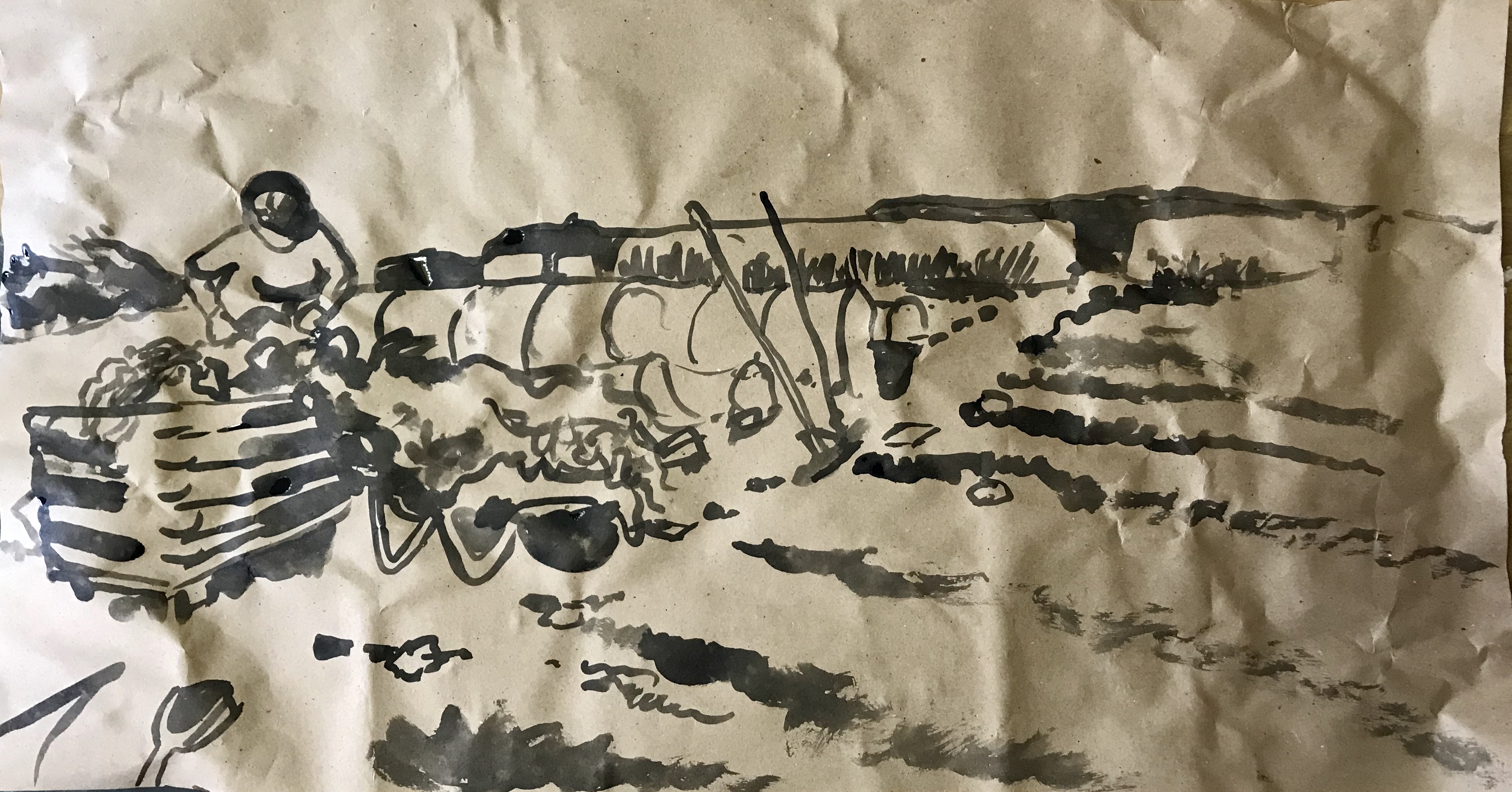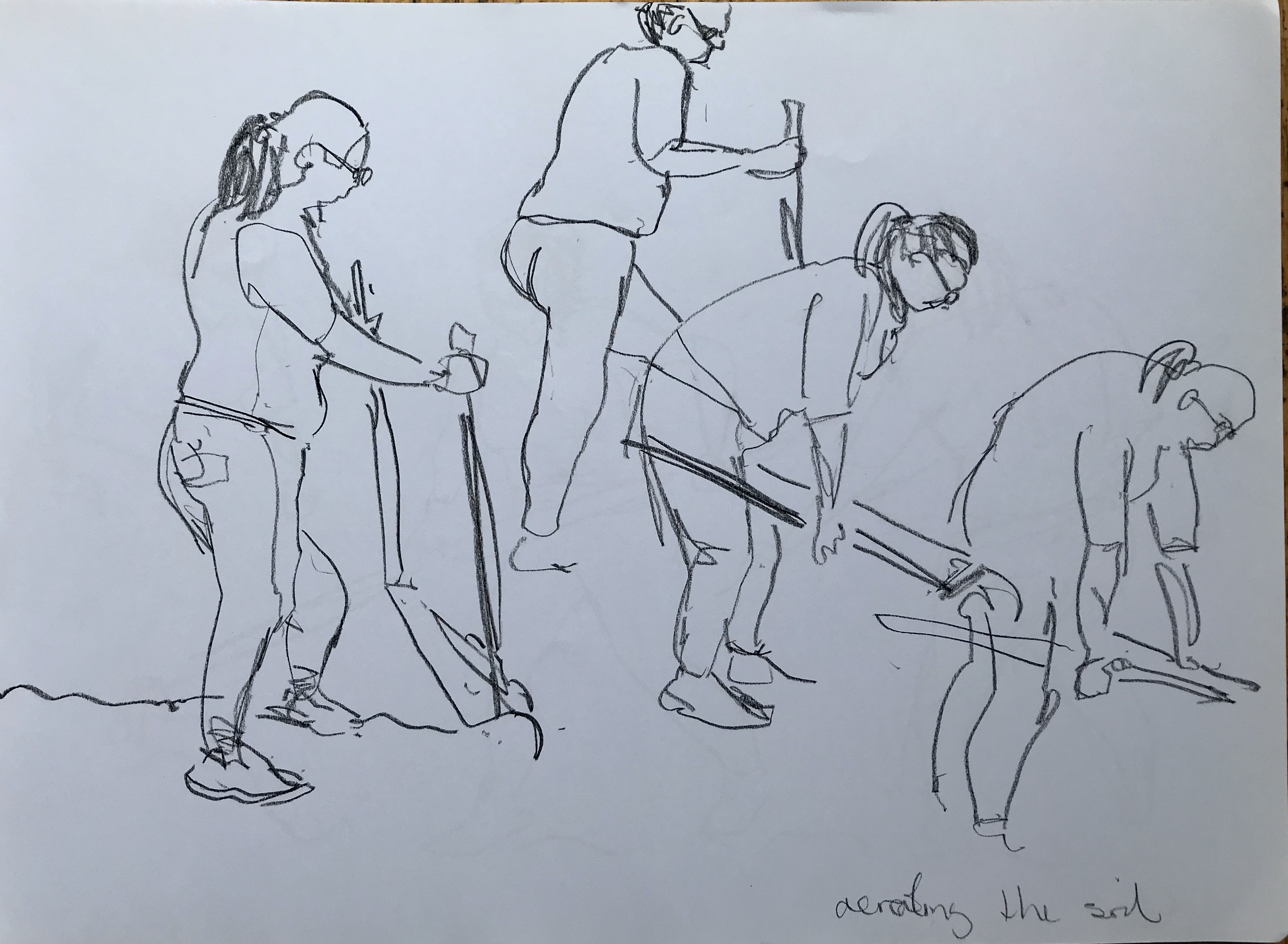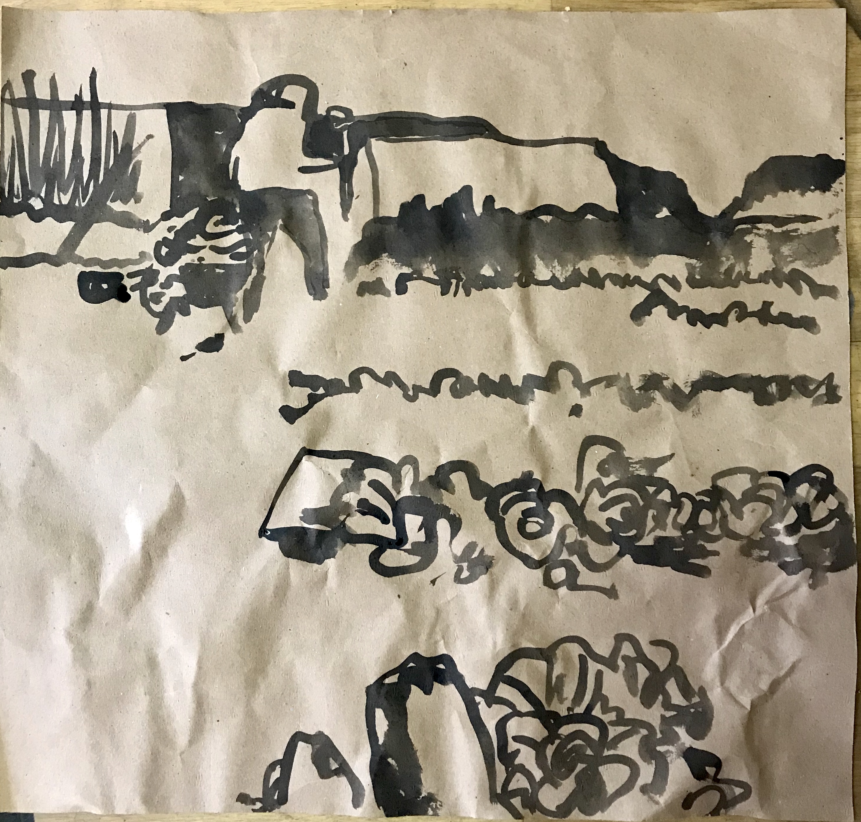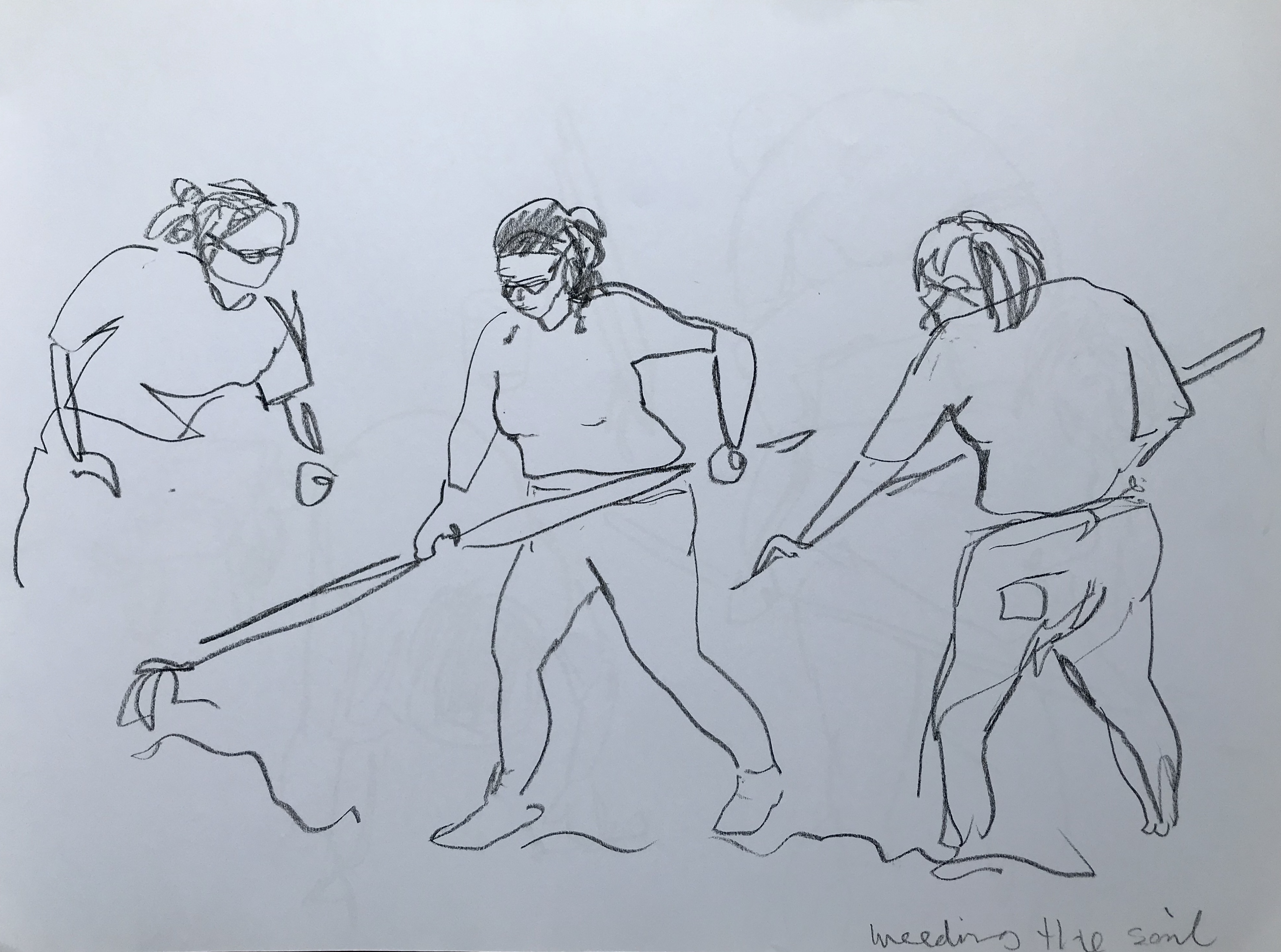 The idea, the brown paper roll idea, came from these 2 drawings above that I’d made on site of the food garden, conveying her repeated movements of weeding and aerating the soil. I will write about these more later. I think as a visual it looks better in real life than here. But I want to develop it further.