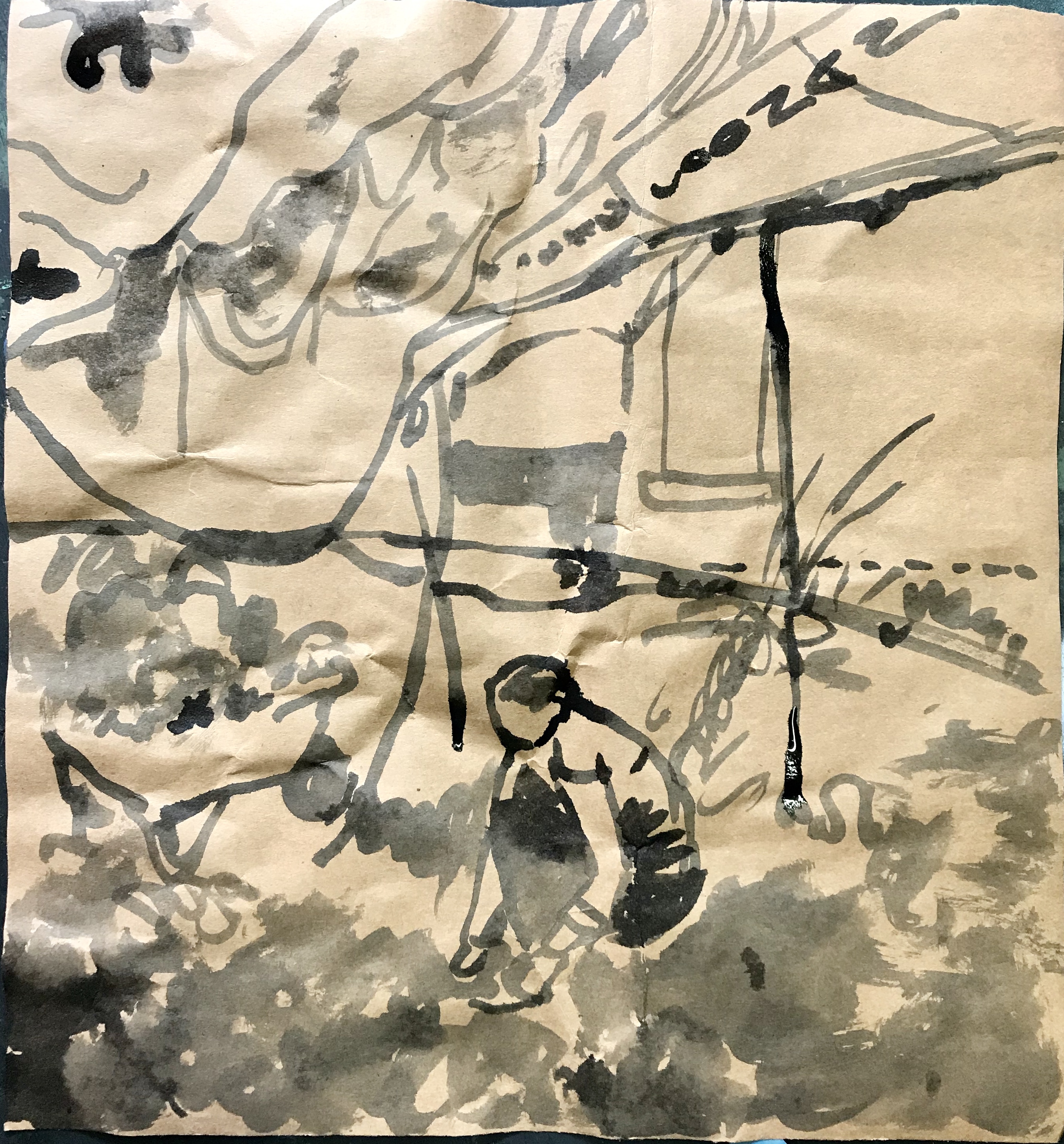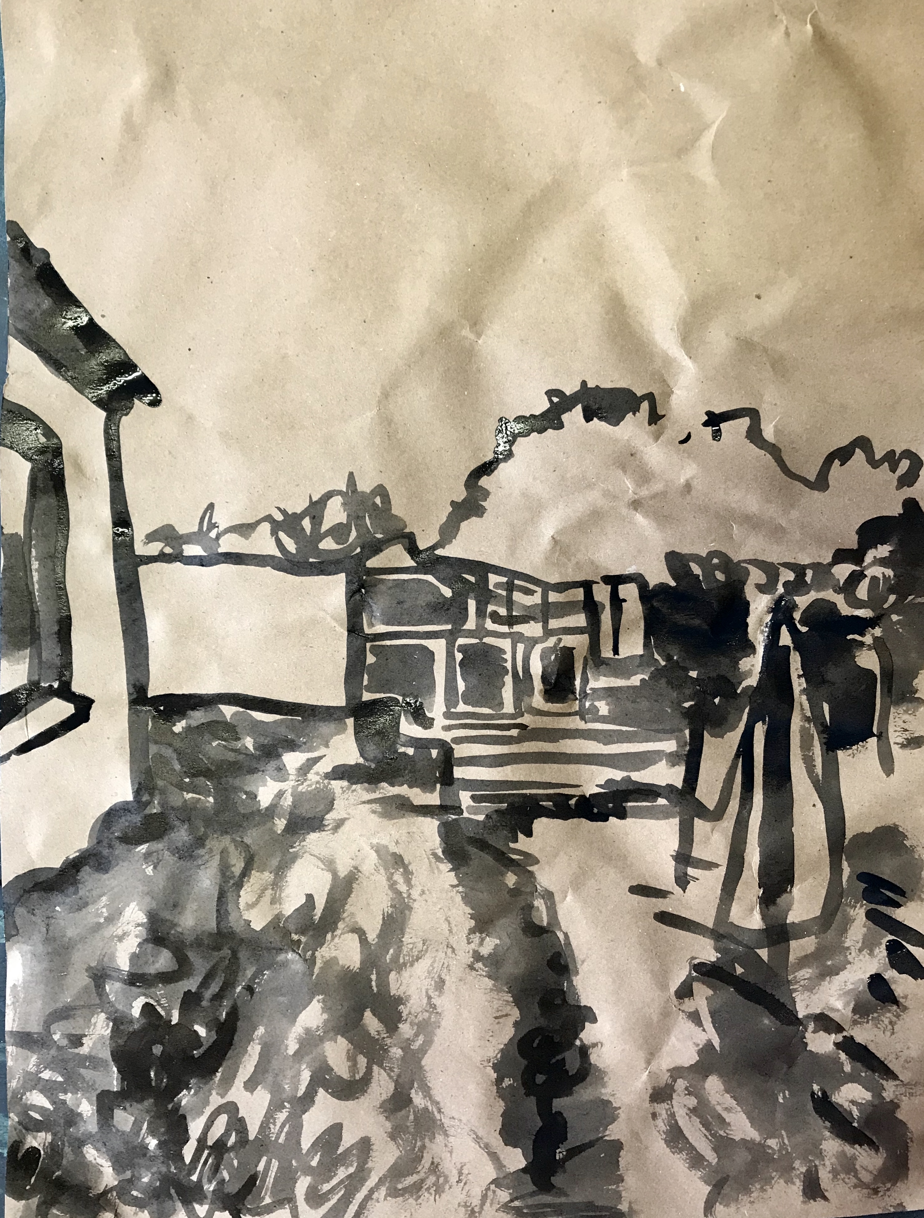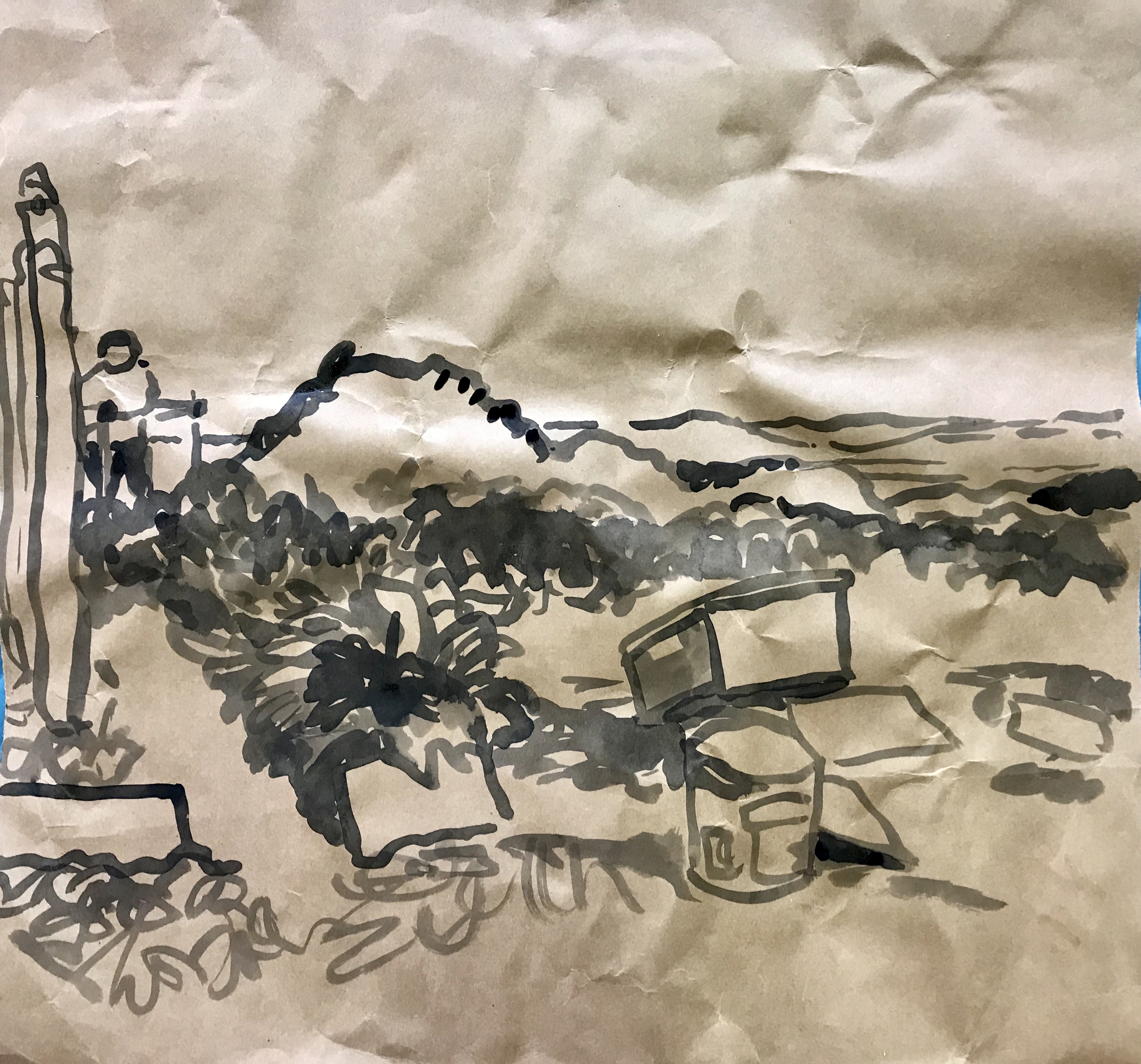 Then I returned to the drawings of Carolin. These are less noisy visually, as they are uniform in their visual make up of land and sky. I wanted to try some of the black ink on brown paper process, see below. These are also approx A3 size: