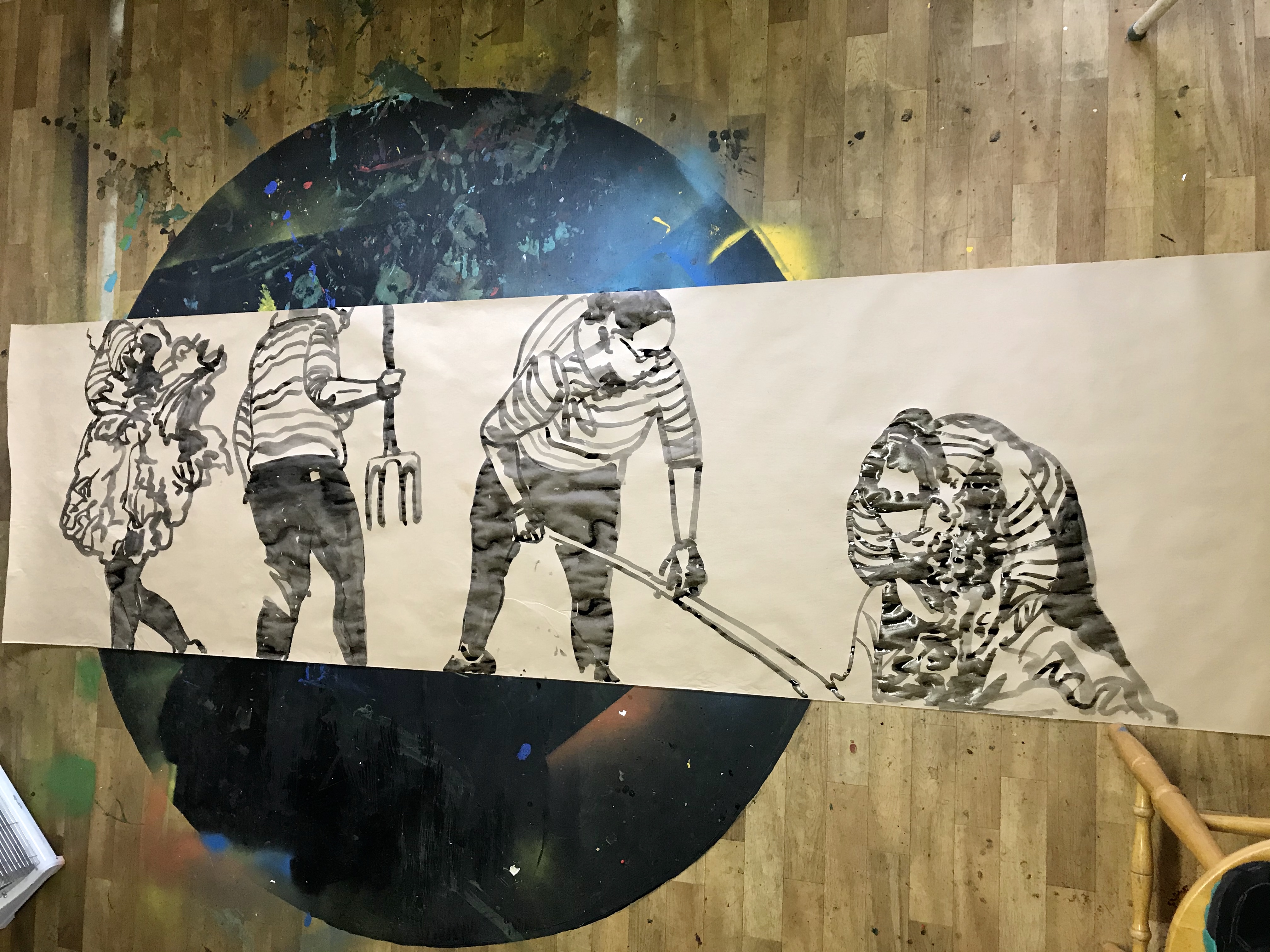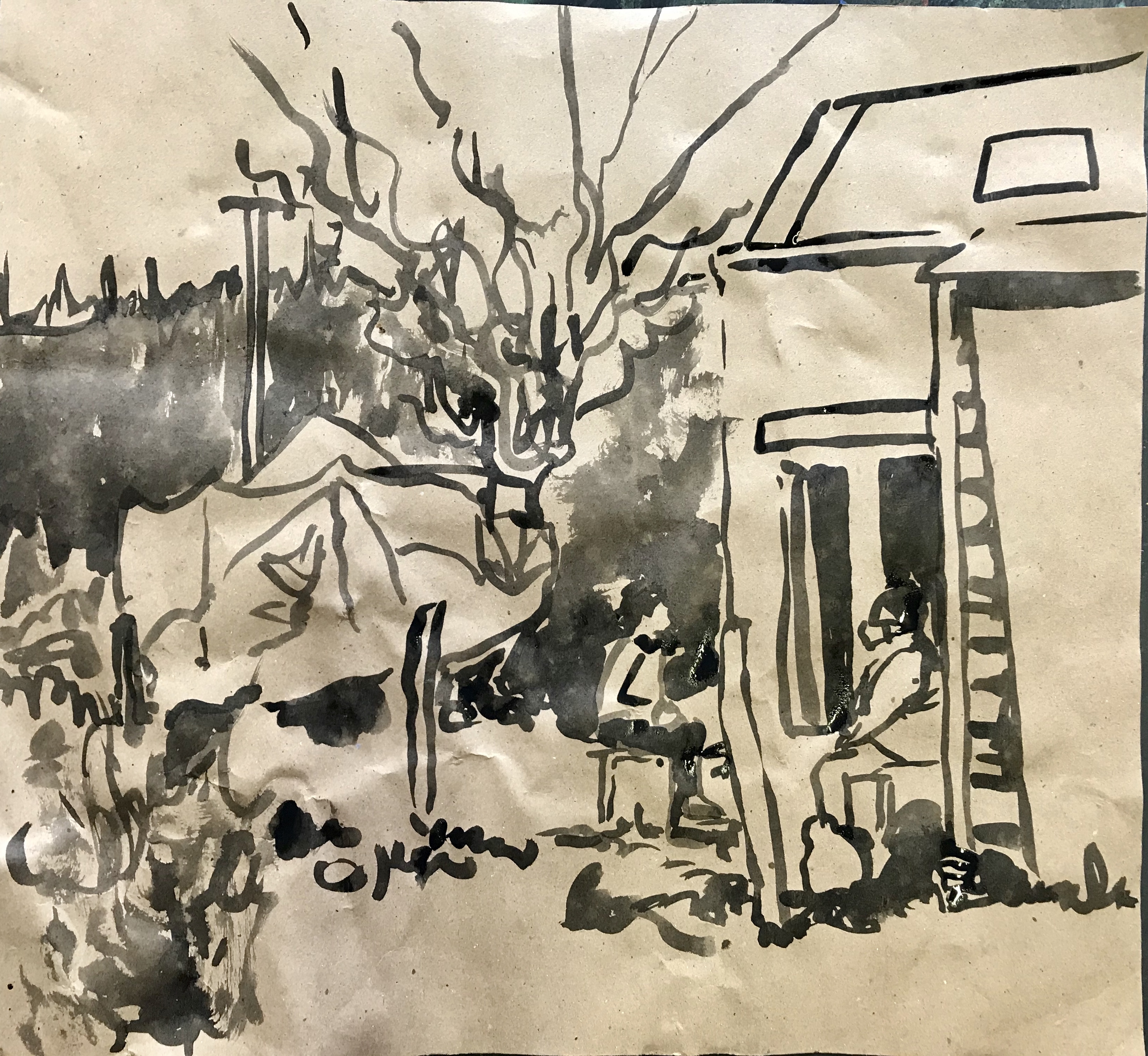 On Friday evening I had drawn a more detailed version of a drawing I’d made of Veerla dismantling her trampoline greenhouse- just to see how it would look