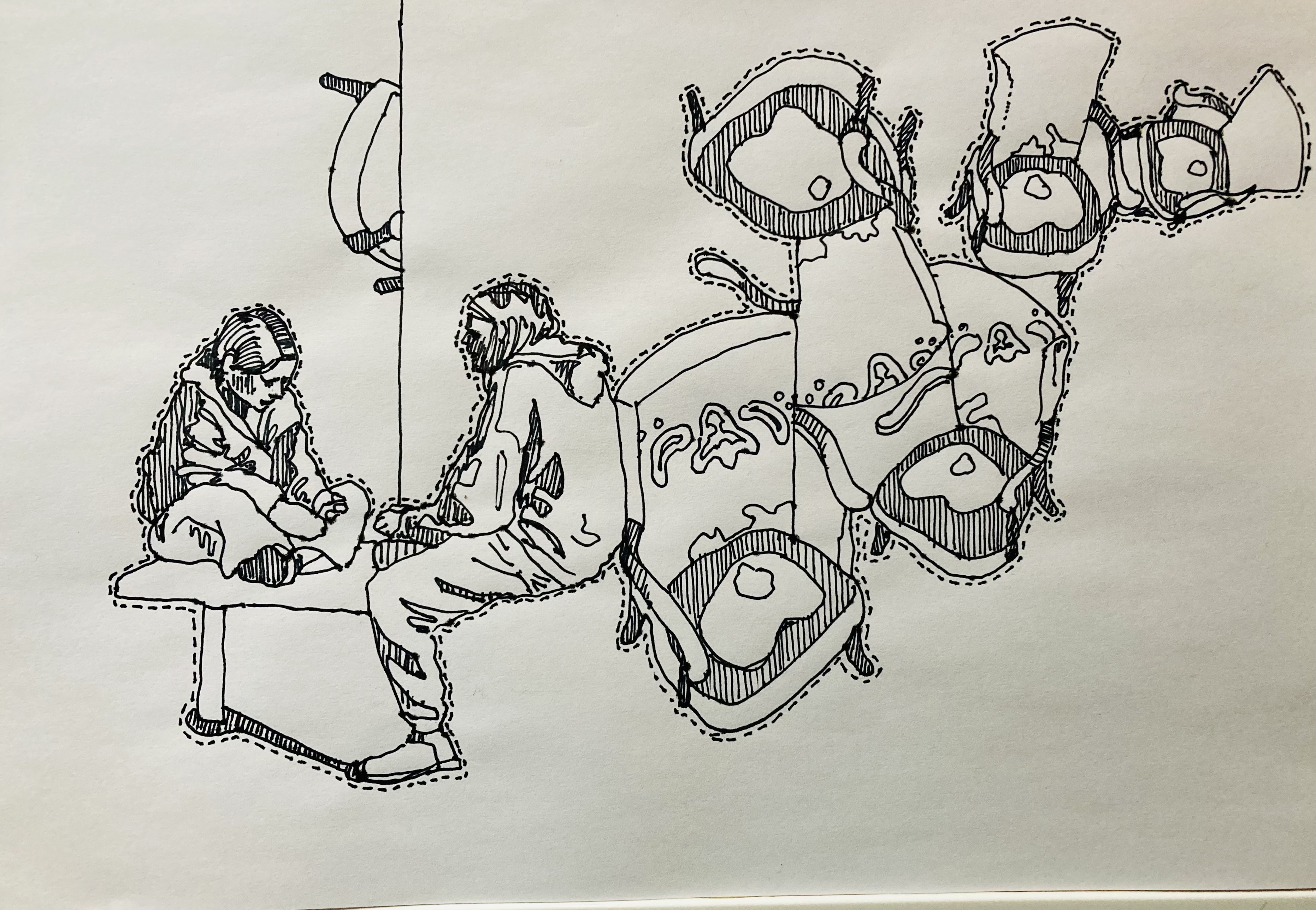 Drawings I have made in response to the prompts sent by Jen on the ogham Residency, a 3 artist process based residency in Catalyst Arts, Belfast. Other artists, sculptor Stephanie Tanner and painter Brian Kielt. Curator Jen Alexander. I asked to make a drawing response each day to a prompt from the space so as to feel more connected to the project. I am only able to get up at the beginning and the end. I went up last weekend and worked in the space on the Saturday, I made a drawing on a sheet of plywood Jen had in the space. Not sure the size of the sheet- maybe 3 x 4 foot? Did not get it finished, so thinking about how to finish it remotely. Currently thinking about layering a red drawing on top- by asking Jen to trace what I want added on to acetate and project it on then draw over the projection. Something that jars with whats already there, not trying to blend in. layering. layers through the window. layers like in Brians work. Made copies of things like in Stephanie’s work.