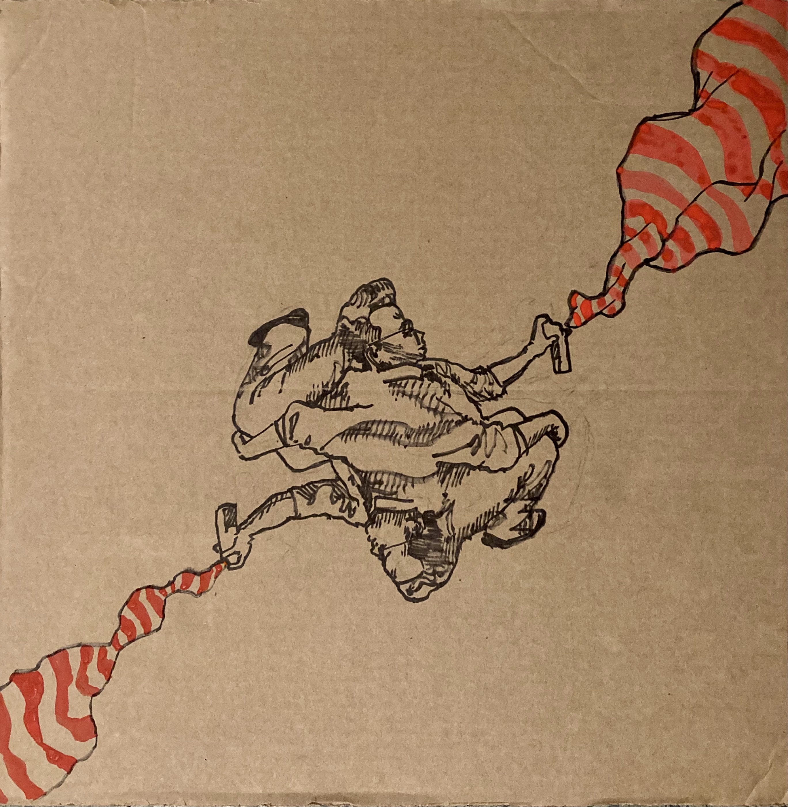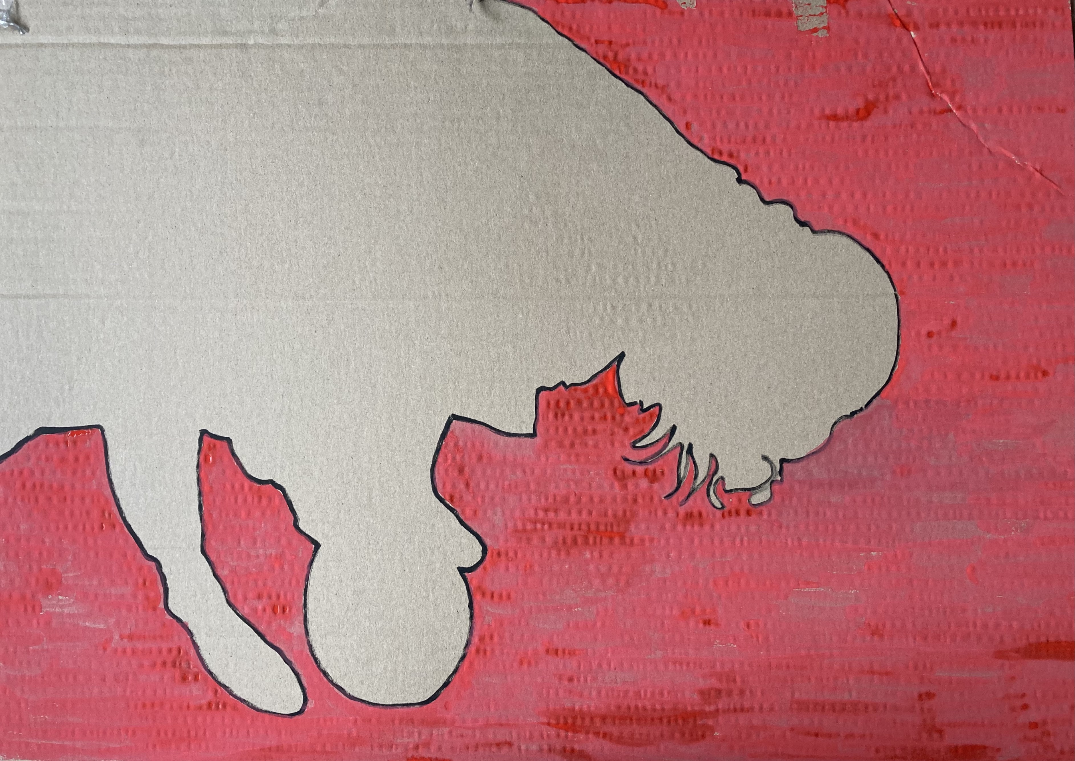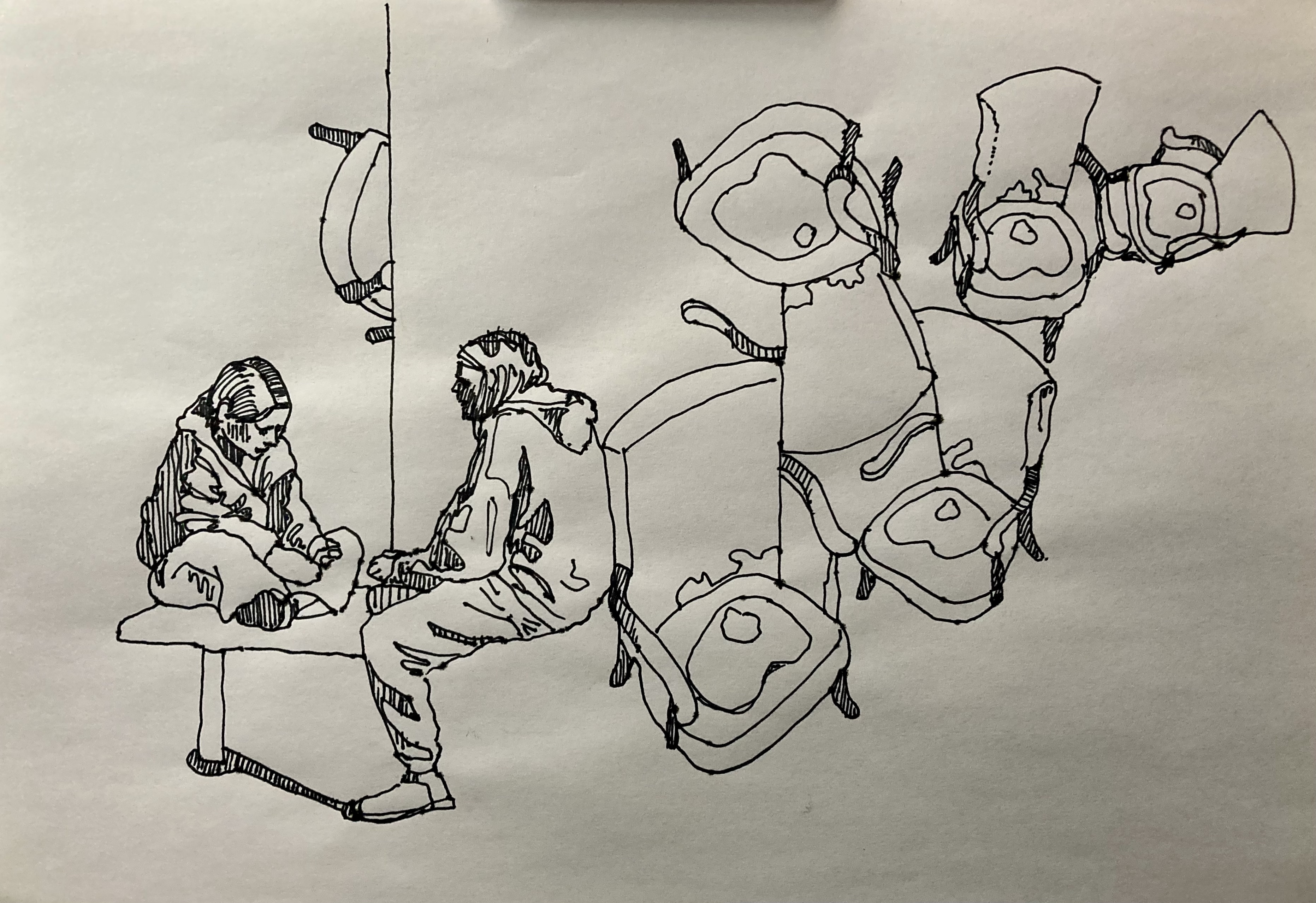 I really like this and am hopeful to see what else can be achieved now. After all I made the drawing whilst thinking about the journey I had made up to the space, and what I saw out of the window of the various trains I had taken. The two other main influences were the relentless imagery of the human misery manifesting itself in Ukraine, on my newsfeed. It had permeated my thoughts to an extent that I didn’t feel like I could make a drawing without referencing it somehow. I drew a version if an image I’d seen of a small boy on a swing in front of a bombed block of what looked like apartments. An adult man stands beside him. It was of course what a kid would want and need, some bit of normality, to go in a swing, in the midst of all this chaos. To me it felt like relevant visual metaphor for the situation at the time, all of us here in our unharmed environments, going about our business as normal, impacted only in our heads and newsfeeds by this awfulness. The other element I wanted to incorporate was the brocade design of the chair Stephanie had selected to work with. I had already used this design in some drawings and was interested in the idea of the pattern creeping across the space, and what it could symbolise. Now thats it’s got added red it has taken on a whole different power.
