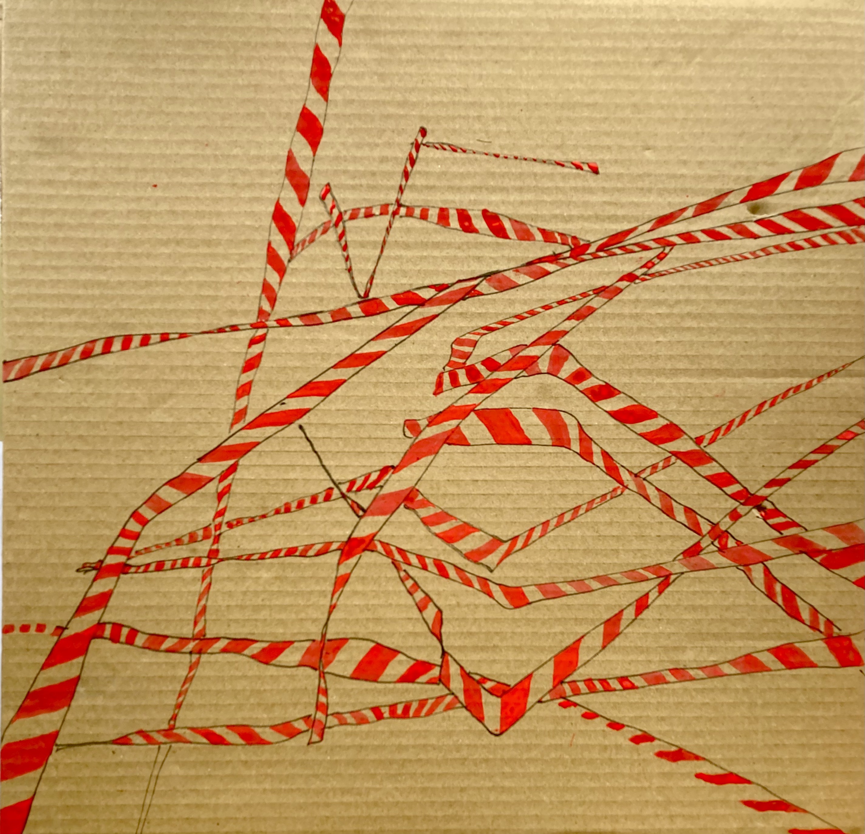 So last week, towards the end fo the week, after thinking about how to progress the drawing and remain part of the residency in situ as well as remotely, I decided to take Jen up on her offer to continue work for me on the plywood drawing- as a way of staying connected to the space and the continuing work and as a way to practically progress the drawing. I was initially a little hesitant as although it had been my idea, I have never asked anyone to work on a drawing before. Then after thinking about it I decided it was a good thing – after all this is a process based residency, and that it would be interesting to see where a collaborative work could go. On the Saturday, when Stephanie and Brian were in the space, Jen went and got red pens and trialled a few colours until we found the right one, and then worked on the drawing as per my instructions. Here is as far as she got: