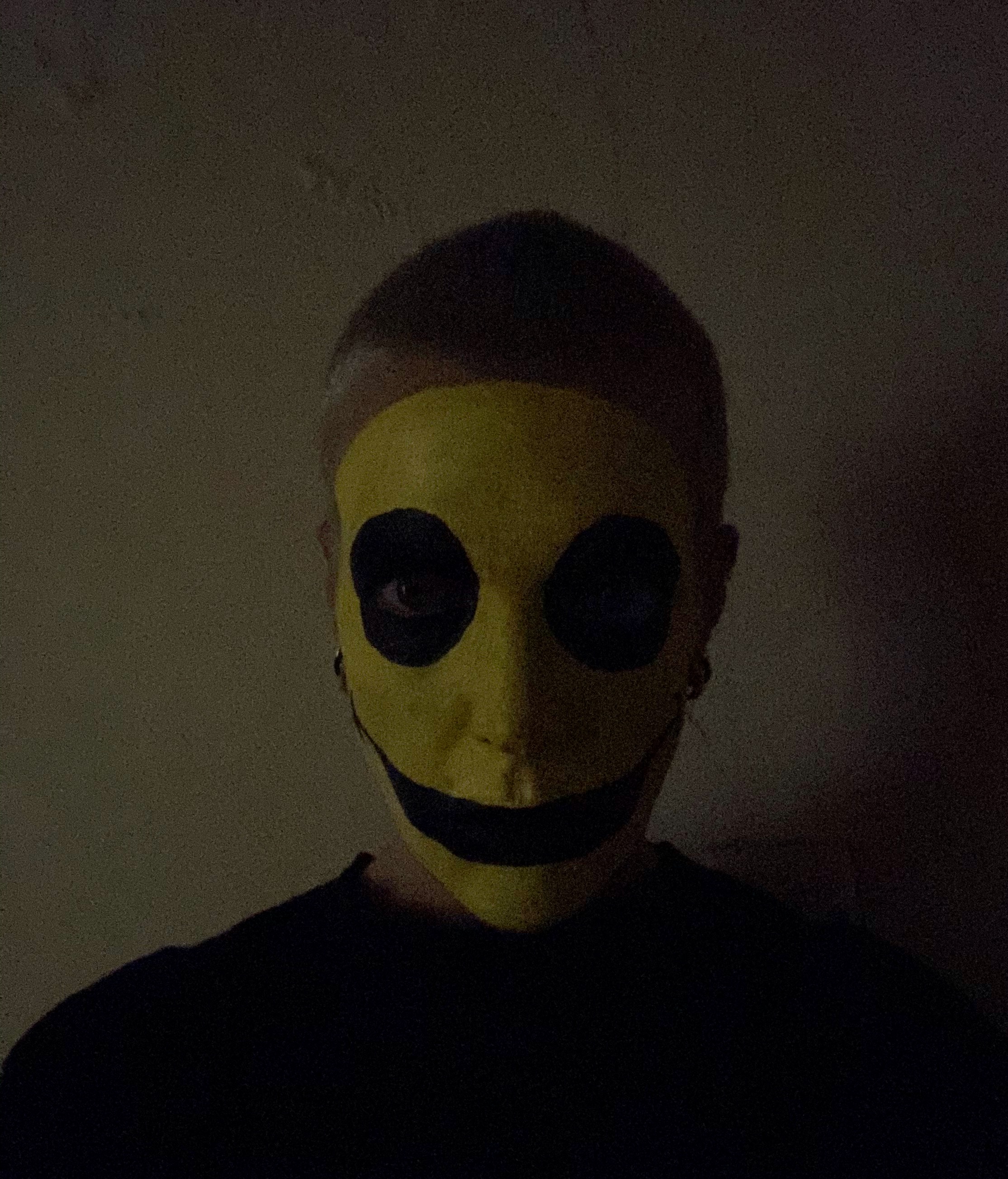 I have been thinking for a while now about an idea for a performance based around smiley face paint, but in a threatening kind of slightly off way. Manic, sick, dangerous smiley. I tried some face paint this evening at the studio. It as not how I had pictured it, I couldn’t decide whether to do paint in a perfectly round, realistic smiley or cover my face completely in yellow paint. I photographed it myself using my tripod in the corridor outside the studio where there is a roof window light, which while probably not cleaned in at least 30 years, gives off a muted light from above, which was what I wanted. The images without flash look as close to what as I was looking for as I could get today.